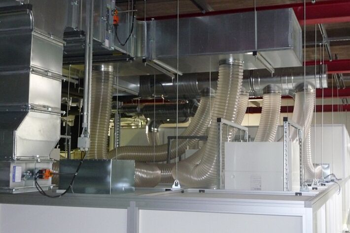 - Zu- und Abluftversorgung der Reinräume mit Auslasskästen (inkl. H14-Filter für die Zuluft) bzw. über Umluft FFUs